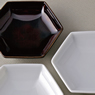 六角小皿 90 × 80 × h 20 白磁、飴釉、ルチール mm